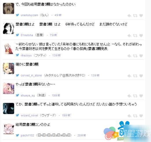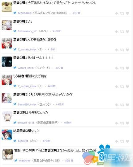 从图片上可以看到,这是niconico直播秋之祭典的时候,网友们发布的评论。基本上大家的意思都是“我还不想放弃啊,求《魔禁三》。”“明年就要高考了,能不能把《魔禁三》放出来让我开心一下啊?”“嗯,我就知道没有《魔禁三》。”而在过去几年电击文库祭典的时候,三木一马还会出来下跪,表示“没有《魔禁三》”,但是今年干脆连这三个字都不提了。因此很多网友都开始觉得真心没有希望了。