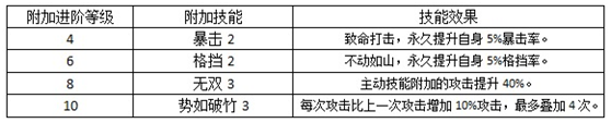 当武将进阶达到一定等级后,会附加特有的武将进阶技能。