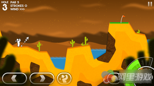 游戏在操作上比较简单,并且在开始部分还设置了一个新手教学环节,只要稍加练习便能轻松上手体验。《超级火柴人高尔夫》将操作分成左右两个部分,在屏幕左下方是两颗左、右调节按键,通过这两颗按键能够360度调整球的飞出角度。屏幕右边则是一颗击打按键,这颗按键有两个作用,第一次点击可以进行力度的调节,第二次点击可直接将球击出,简单粗暴。