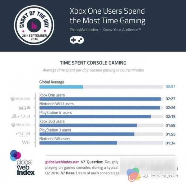 一项由 Global Windex 进行的调查显示,Xbox One 用户比其余所有游戏平台(包括 PC)用户的游玩时间都要多,其次便是任天堂 Wii U 主机用户,不过他们只落后 Xbox One 用户的每日平均游戏时长(约两个半小时)一分钟,差距非常小。第三才是 PS4,随后又是微软家的 Xbox 360。