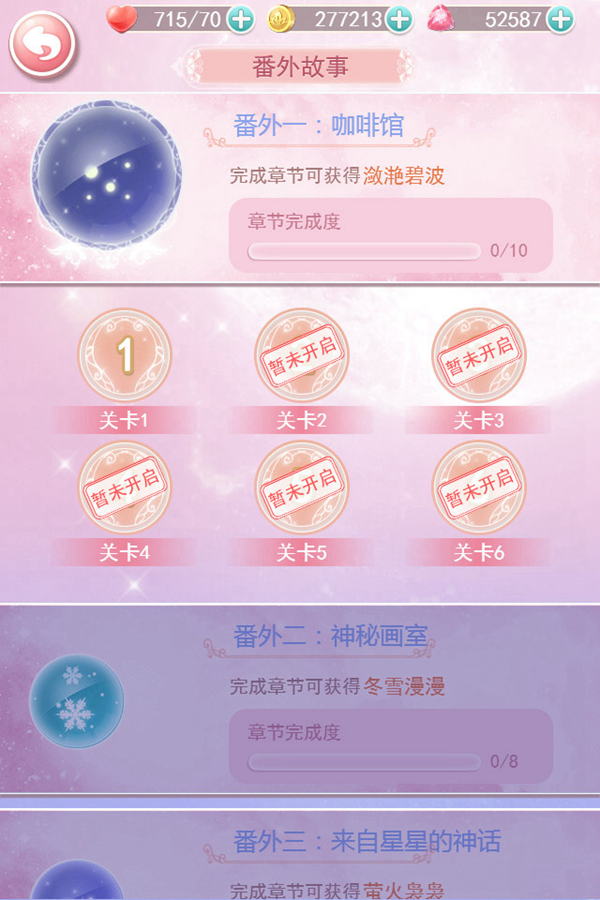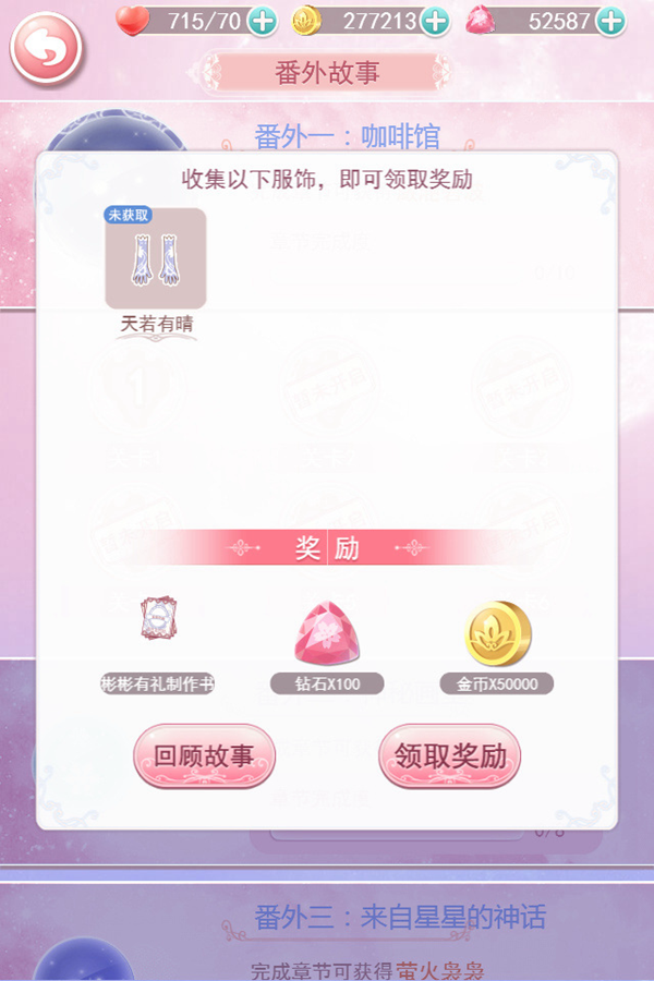 可以看到有好多的故事呢,如果要查看后面的故事,必须先要解锁前面的故事呢。解锁的条件其实就是搜集指定服装啦。