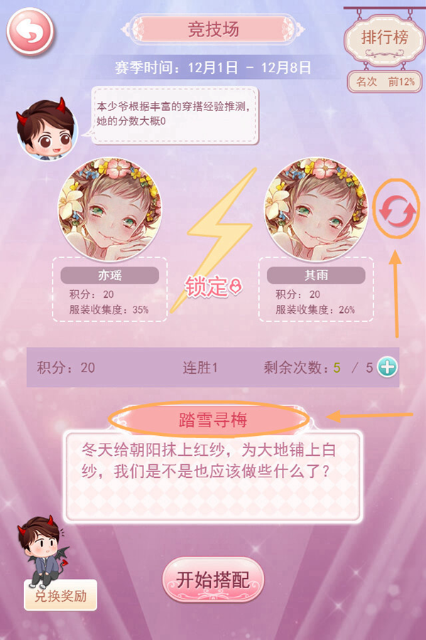 点击“登上舞台”会自动匹配分数相近的对手,如果没有把握,还可以刷新对手。这次的主题是“踏雪寻梅”,你猜猜比拼的风格是什么呢?小编猜测是“保暖”。