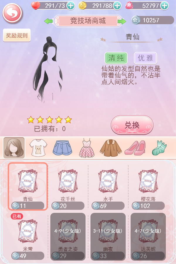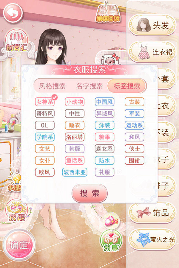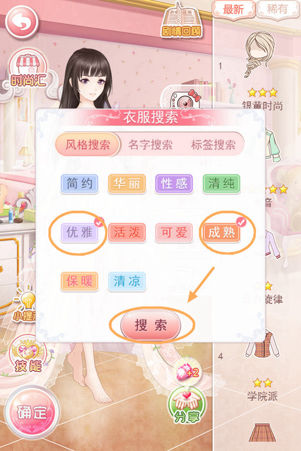 然后,点击“搜索”按钮,勾选对应的风格,点击搜索,就会在右方展示出拥有“优雅、成熟”风格的所有服装了呢,是不是很方便呢。当然,星级越高的服装加分越多,越容易通关啦。