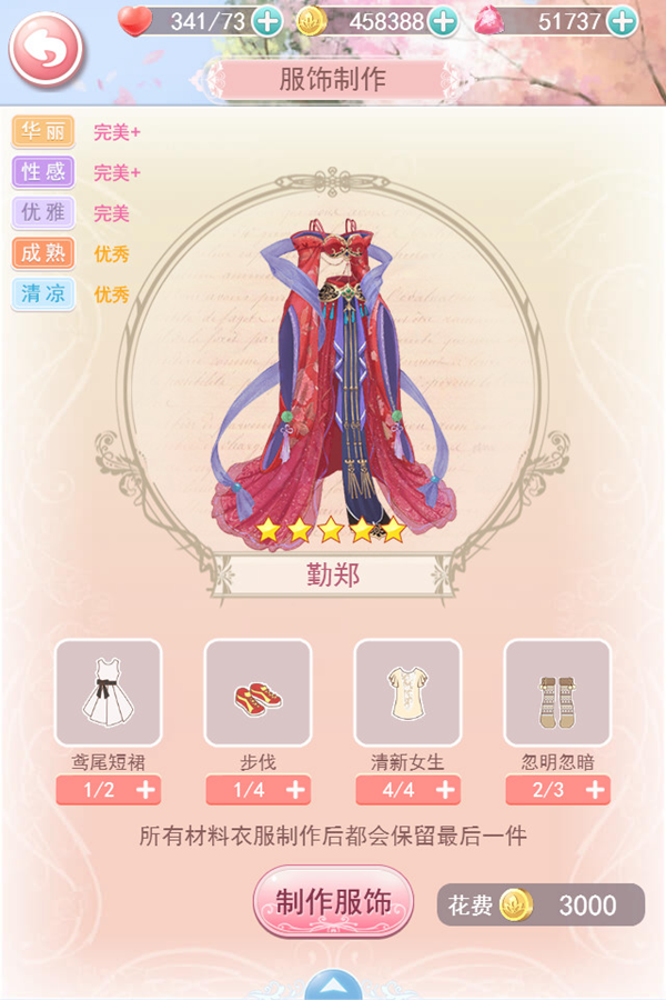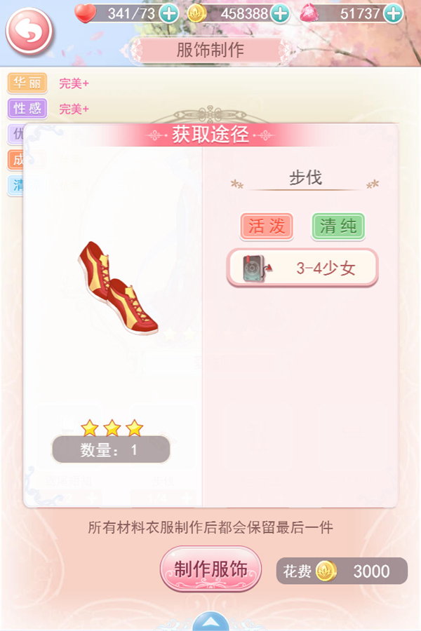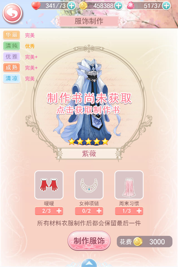 点击任意服装,正中间显示制作后的服装外观,左上方显示服装的属性,下方则显示制作所需要的材料。不愧是五星服装,好多完美呢。
