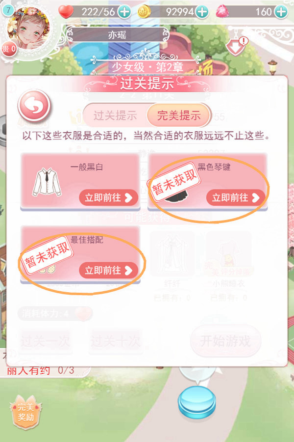 步骤二:选择“过关提示”或“完美提示”,搜集对应的服装。前者只能保证通关,后者可以保证完美通关呢。