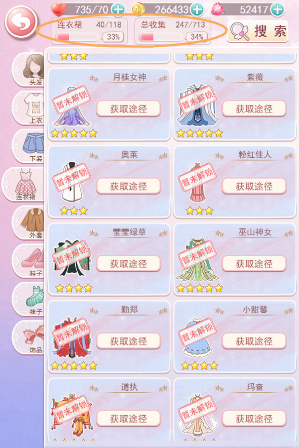 点击“衣橱”可以看到已拥有的服装,上方还可以看到这个类别的搜集的进度呢。
