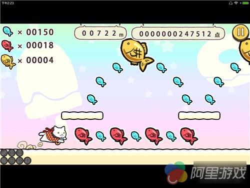 在跑酷的过程中,玩家只需要点击屏幕即可让猫咪跳跃,点击两次可以连跳。除了有普通的蓝色小鱼,还有红色、金色的大鱼可以get,如果碰到彩虹色的鱼,则可进入到奖励画面,猫咪会进入另一个地方继续跑,没有障碍物,一心得高分就行了!非常之爽!游戏中除了有固定的障碍物、河水这些需要进行躲避,还会有纸团、垃圾等不定时的向猫咪飞过来,不过在飞来之前会有声音提示,要小心躲避开哦!