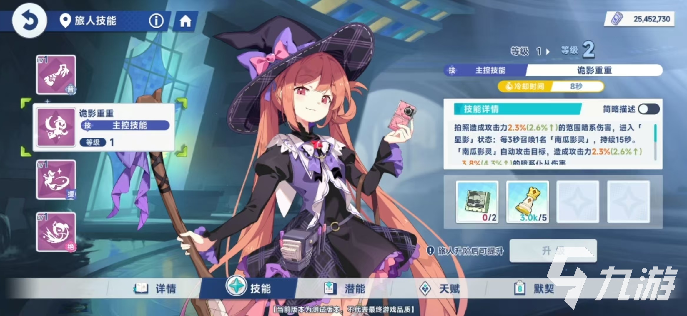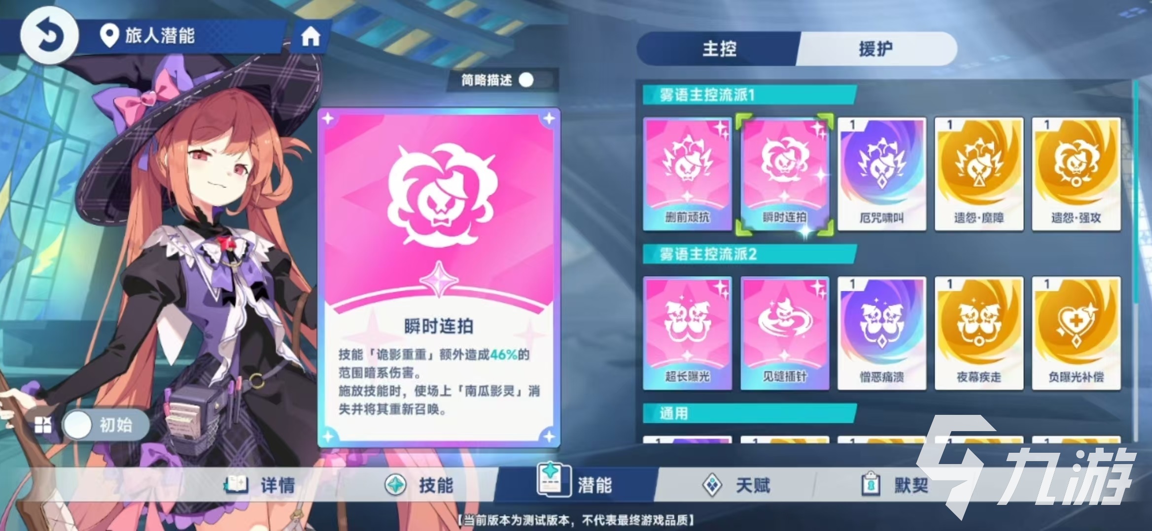 援护技能效果是召唤出法阵,每0.5秒钟就能召唤出一个提灯影灵,持续6秒,提灯影灵通过自爆,可以造成暗系仆从伤害,并附加暗吸印记。绝招效果是生成巨大影灵,对目标造成多次大范围暗系伤害。潜能方面可以选择删前顽抗、瞬时连拍、厄咒啸叫等。删前顽抗可以使技能诡影重重冷却时间缩短,在南瓜影灵消失时产生自爆,造成暗系仆从伤害。瞬时连拍使得技能诡影重重额外造成伤害,并在释放技能时,使场上的南瓜影灵消失重新召唤出来,重新计算时间。