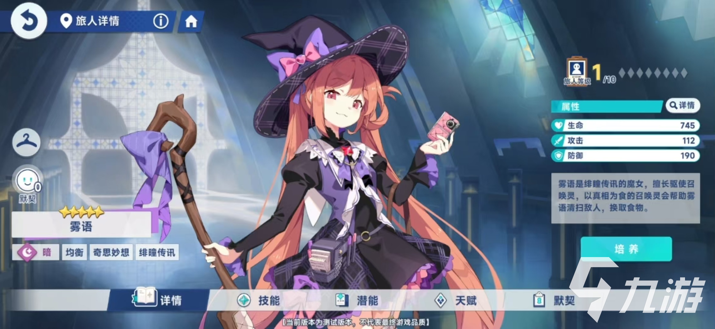 在游戏中,雾语是属于五星级稀有属性的暗元素角色,属于远程魔法输出类型,它的魔法技能具有高额伤害输出能力。普通攻击彗星连锁,挥舞扫把连续攻击目标4次,造成范围暗系伤害。主控技能诡影重重,造成暗系伤害后进入显影状态,每三秒钟就能召唤出一名南瓜影灵,南瓜影灵持续15秒,会自动攻击目标,造成暗系仆从伤害。南瓜影灵最多能够存在4个,无论是自身技能还是南瓜影灵,只要触发任意的暗系印记时,都可附加印记伤害,并添加暗灼,使其持续受到暗系印记伤害。