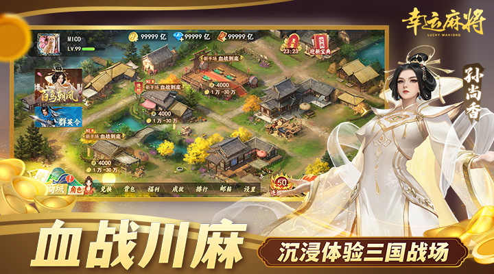 《幸运麻将》是一款全景3D还原三国世界的真人对战麻将游戏,实景大地图自由穿梭,川麻血战点燃战火!三国武将化身3D角色对战,连胜闯关赢取超多福利,真正的实力竞技,等你来战! 【三国血战,川麻争霸】数亿玩家真人竞技,高手云集;经典融合,邀您一起争雀圣! 【连胜之路,实物无限】公平对局,局局赢福卡,电脑手机无限兑!万元豪礼无限送! 【3D武将,陪战麻桌】全3D史诗英雄强势来袭,伴你征战麻将江湖;专属天赋