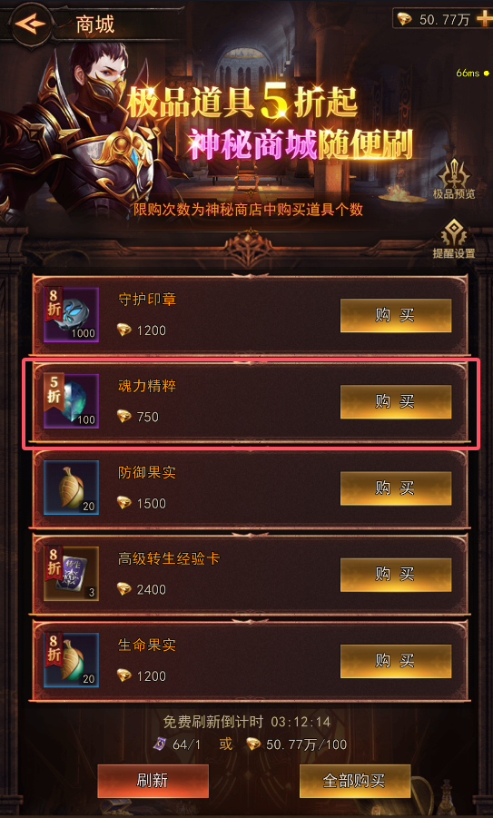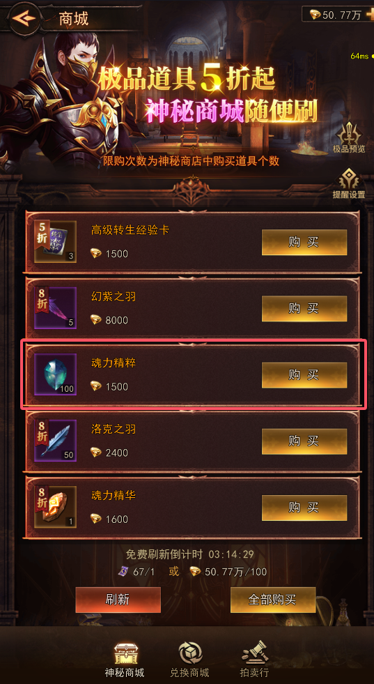 在此商城中,玩家可使用钻石直接购买魂力精粹。