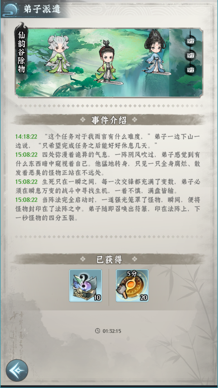 ● 派遣任务:建造宗门大殿后解锁此功能,每日会自动刷新数个事件,指派符合条件的弟子完成,可获得物资奖励。升级大殿能提升每日任务数量与等级,高难度任务对弟子资质要求更高,但奖励也更为丰厚。