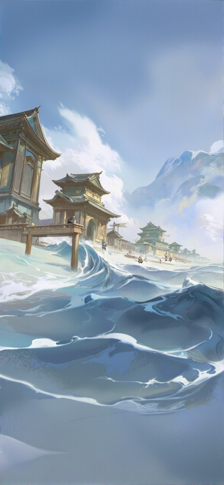 您看这张图,这是海中的一个小村子,此刻正云散天开、一派风清日朗之景。