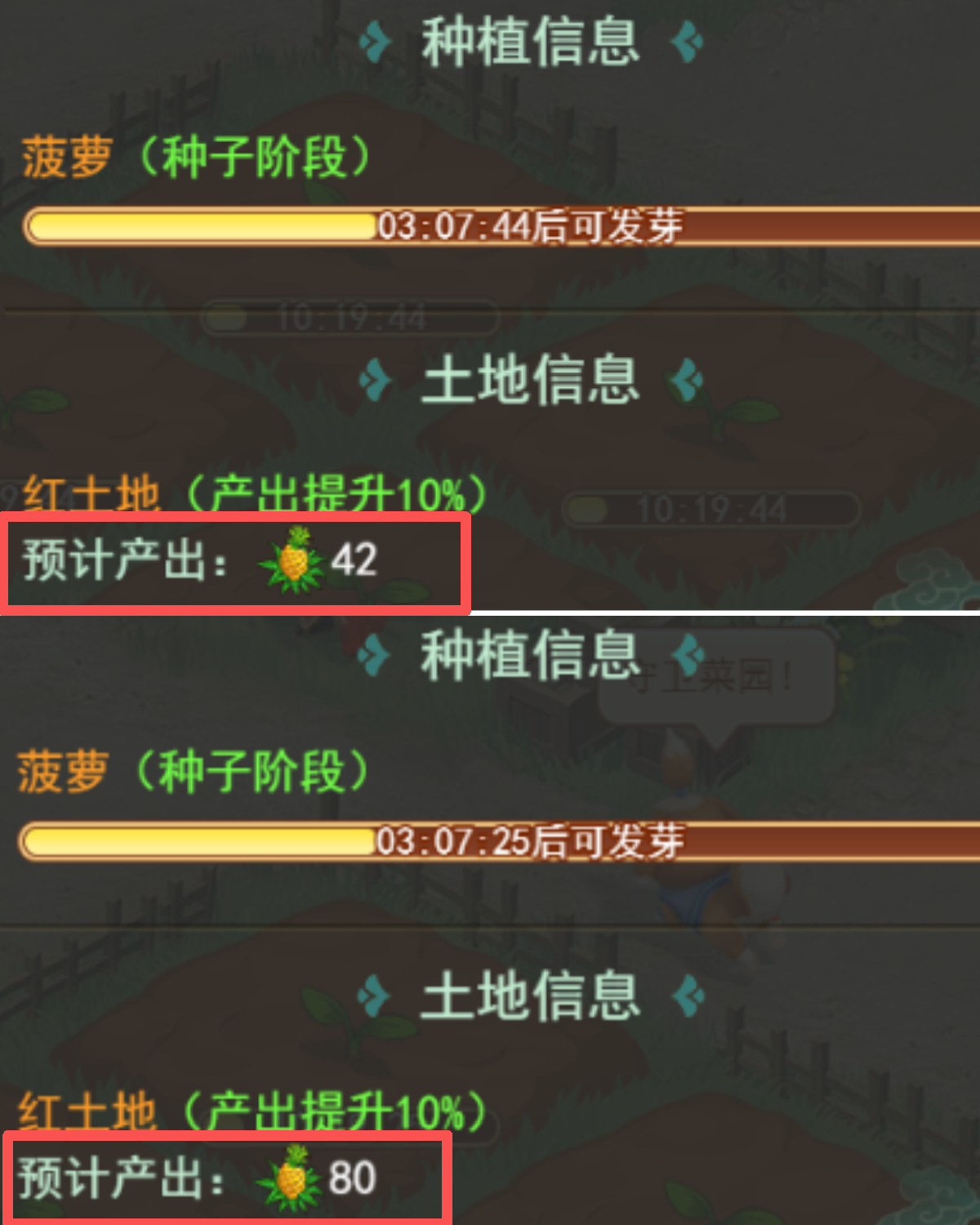 当预估产量可以进入前5%或可刷新当前个人记录时,需在作物成熟前10分钟上线,进行除虫和浇水,若未及时处理会降低作物产量。