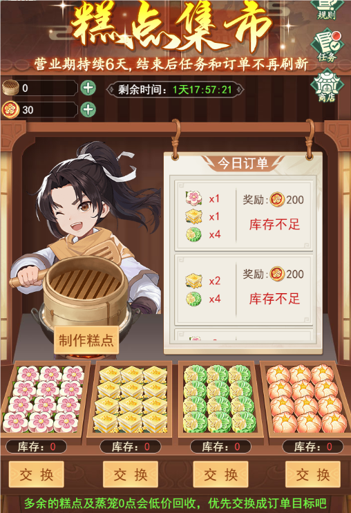 3、营业期每日0点刷新3个订单,提交订单所需糕点即可获得奖励[小糕币]