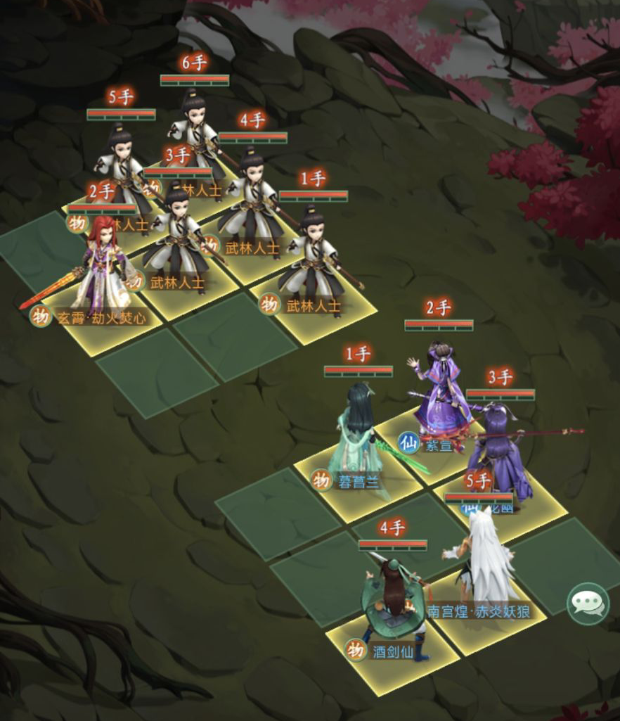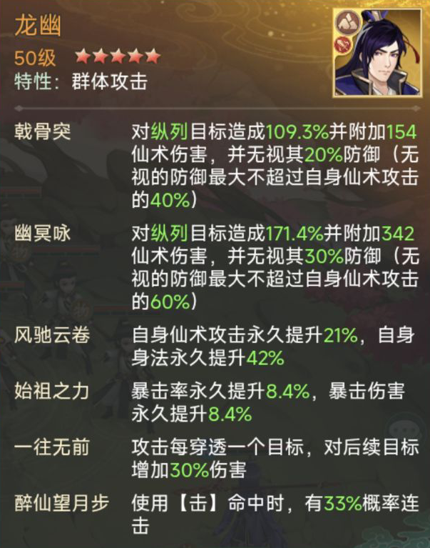 龙幽放3号位,龙幽普攻“戟骨突”对纵列目标造成伤害,并无视其20%防御,被动“一往无前”攻击每穿透一个目标,对后续目标增加30%伤害,放在3号位可以直接打击一整列目标,且自身被动“醉仙望月步”命中目标时,有33%概率进行连击,前期尽可能的在首回合或第二回合触发一次连击,即可让南宫煌补刀全清场上右侧纵列武林人士,便于后续伙伴减少场上武林人士带来的伤害,专心对玄霄造成伤害。