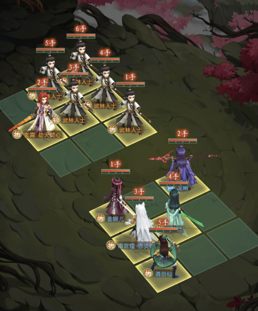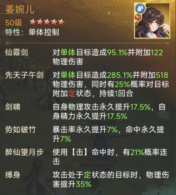 姜婉儿放1号位,姜婉儿使用击命中时有21%概率连击,绝技“先天子午剑”对单体目标造成伤害,并有25%概率对目标造成“定”状态,攻击定状态的目标时,物理伤害提升35%,需要姜婉儿在第3回合时控住玄霄,在保证队友存活的同时还能提升物理伤害。