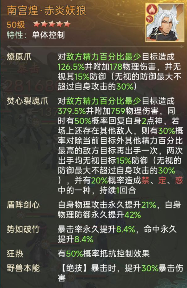 南宫煌·赤炎妖狼放4号位,普攻“燎原爪”对敌方精力百分比最少目标造成伤害,前期(补刀),绝技“焚心裂魂爪”同样对敌方精力百分比最少目标造成伤害,绝技有50%概率回复自身2点神(打高分需凹,确保姜婉儿/紫萱眩晕玄霄以及玄霄绝技避开对南宫煌造成致命伤害),关键2点神可让南宫煌·赤炎妖狼在第五回合时,再开一次绝技,自身被动“野兽本能”绝技暴击时,提升30%暴击伤害,进一步拉高总分值。