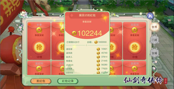 纵观仙剑六界,没有什么内容可以比抢红包更令人高兴!于是,红包玩法被研发小哥哥隆重推荐为极其“愉悦心情”的养生玩法TOP2!在《仙剑奇侠传移动版》中,红包的价值以及个数可以自由设定。玩家只需要及时关注游戏主界面左上角的红包键,快速点击即可进入频道凭手速领红包!喜欢结交朋友的玩家,在世界频道上发适当的红包,也是一种迅速打开社交圈的便捷方式哦~