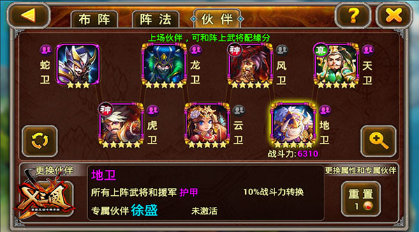 有小伙伴的强势围观,场上的萌将们才能拿出百分百的战斗力来奋力厮杀!武将伙伴系统是缘分系统的无限延伸,主力武将所有的缘分都可以通过伙伴系统来激活!天地风云龙虎蛇,7个位置均可以添加小伙伴来助阵,简直流弊的飞起来啦!