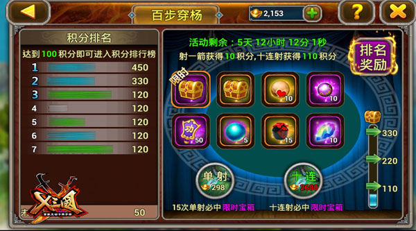 别以为射箭拿个礼包就完事啦!这仅仅是前戏而已,真正的高潮其实是闪着耀眼金光的“排行奖励”!主公们只要射箭就能获得一定的积分,积分累积得越多,主公的名号就会粗线在高大上的“百步穿杨”积分排行榜上,战力不够玩积分,一样可以率先问鼎巅峰,让全服玩家膜拜哦!“百步穿杨大赏”完全不输群雄争霸等其他战场的奖励,主公好好把握良机,逆袭大神指日可待!