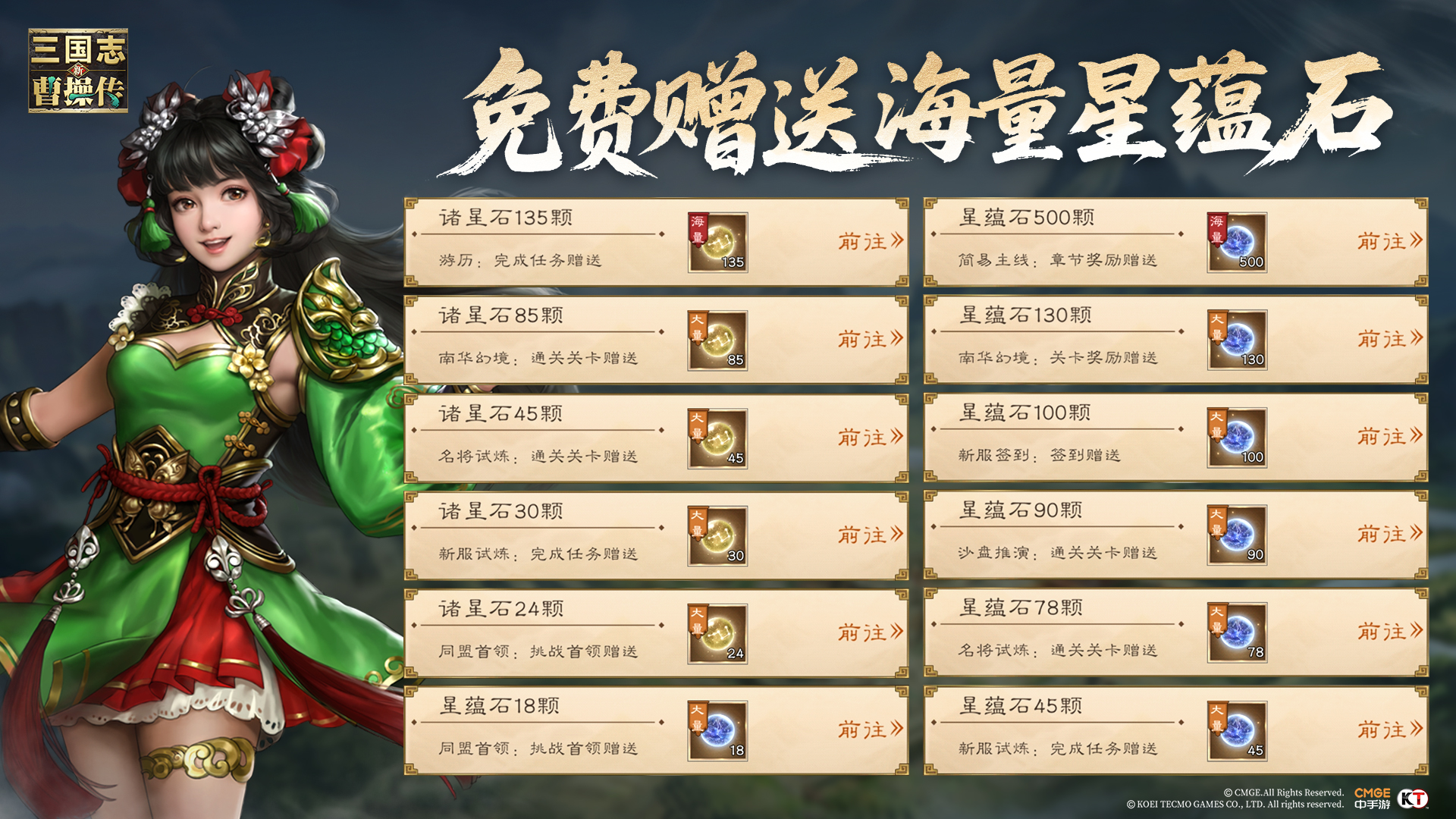 配合 GVG、GVE 玩法,此次开服更搭配千抽盛宴。在点将台自选送全橙卡的基础上,玩家累计获得超过 1000 抽的游戏福利内容,配合极具良心的爆率,每一次金光都是武将升星升红的盛宴。除此之外,还有精心准备的十六大橙将任意自选宝箱,帮助每一位英雄的梦幻阵容成型的同时,精准强化,不再有重复抽卡的遗憾。