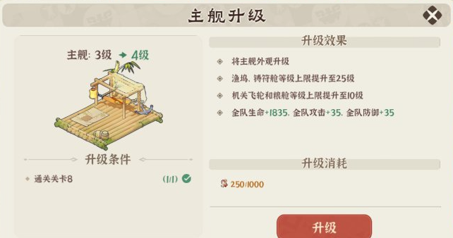 因为游戏的背景设定是海上漂流,所以战船其实就相当于我们的主城,大家一开始只有一个小小的木筏,需要收集材料一步步升级,将其提升成一座规模宏大的战船,在这个过程中战船的外观也会发生改变,给大家很强的经营感,并且战场内部还会有粮仓、历练、军团等等多个功能,而想解锁升级它们所消耗的资源就是简单的主舰经验等。