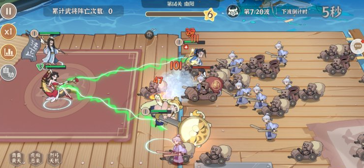 如果打单人pve战斗的话最多能上阵5位,而双人合作挑战是每人上阵3位,彼此之间相互合作战斗,一场之间会有20次的随机选择,大家就是要在这随机选择中一点点构筑出自己的阵容和养成线,形成不同的战斗流派开启战斗,在战斗过程武将可以复活,每一次复活都有20到30秒的冷却时间,只要不是全军覆没都可以继续战斗,只要熬过20波次的怪物就成功胜利。