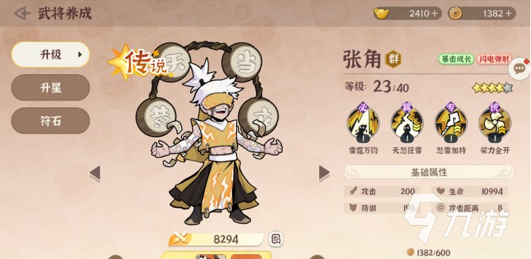 张角也是一名法师角色,暴击成长上限高,具有闪电弹射特性,在战斗时能对敌方造成高额伤害,是个输出非常在线的角色。2技能”雷霆万钧”,发动后,对敌方生命值最低的3个单位打出960%伤害,战场上每多1个队友,技能目标就加1。3技能”天怒狂雷”,需要20秒冷却,对距离自己最近的敌人造成攻击力为500%伤害,并提高他自己10%增伤。4技能”怒雷加持”,每累计击杀15个目标后使用,提高自身10%攻击力。”桨力全开”能让全局金币的产出提高3%。