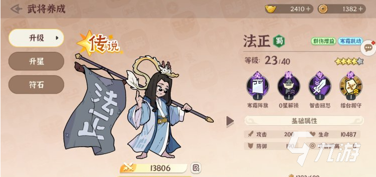 法正是个法师武将,善于大群体增伤,利用寒霜进行联动,在战斗中不仅输出能力十分强大,同时控制能力也很突出,能控制敌方,打乱对手的节奏,给自己或友方创造更大的输出空间,擅长把控战场节奏。1技能”寒霜阵旗”,需要在怒气值积攒到满1000后才能启动,将目标作为中心,半径1格范围内的地方目标,每0.8秒造成100%伤害,可持续5秒,每次造成损伤时有50%几率给敌人附加“寒霜”状态。2技能”智击回怒”,任意地方目标被添加寒霜状态时,20%几率发动,回复30点自身怒气。3技能“擂台据守”,竞技场战斗时,己方伤害减免提高1%。