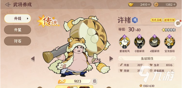 这个武将具有铁虎召唤、眩晕控制能力,是个能力比较出众的坦克,在前线可承受大量伤害,并将敌方控制,给输出创造机会,能较大限度的保证后排输出的安全。1技能”重锤旋风”,同样有怒气条件,对自己周围1格内的敌方目标,每隔0.4秒就对敌人造成60%伤害,每次造成伤害时有10%几率给对手添加眩晕状态。