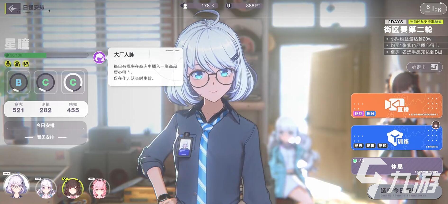 在游戏中,你每天需要为管理的虚拟主播安排日常活动,主要是在直播、训练和休息三者之间做出选择。直播可以帮助提升主播的粉丝数量和获取直播积分;训练则能增强她们的战斗属性,比如意志、逻辑和感知;休息则用于降低她们的压力值,压力过高会带来训练效率下降甚至触发负面事件。这四项核心数值会直接影响到战斗表现,比如意志关系到技能释放频率,粉丝数则影响战斗时的士气加成。