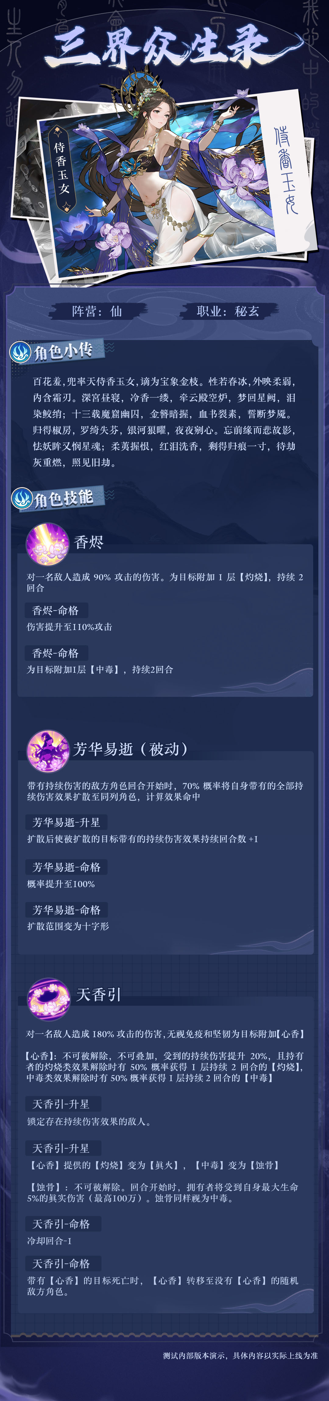 花香腻,星宿遥,空痕难填。11月21日2.3(上)新版本「玉女百花」即将上线,全新绝品秘玄角色「侍香玉女(仙)」登场!