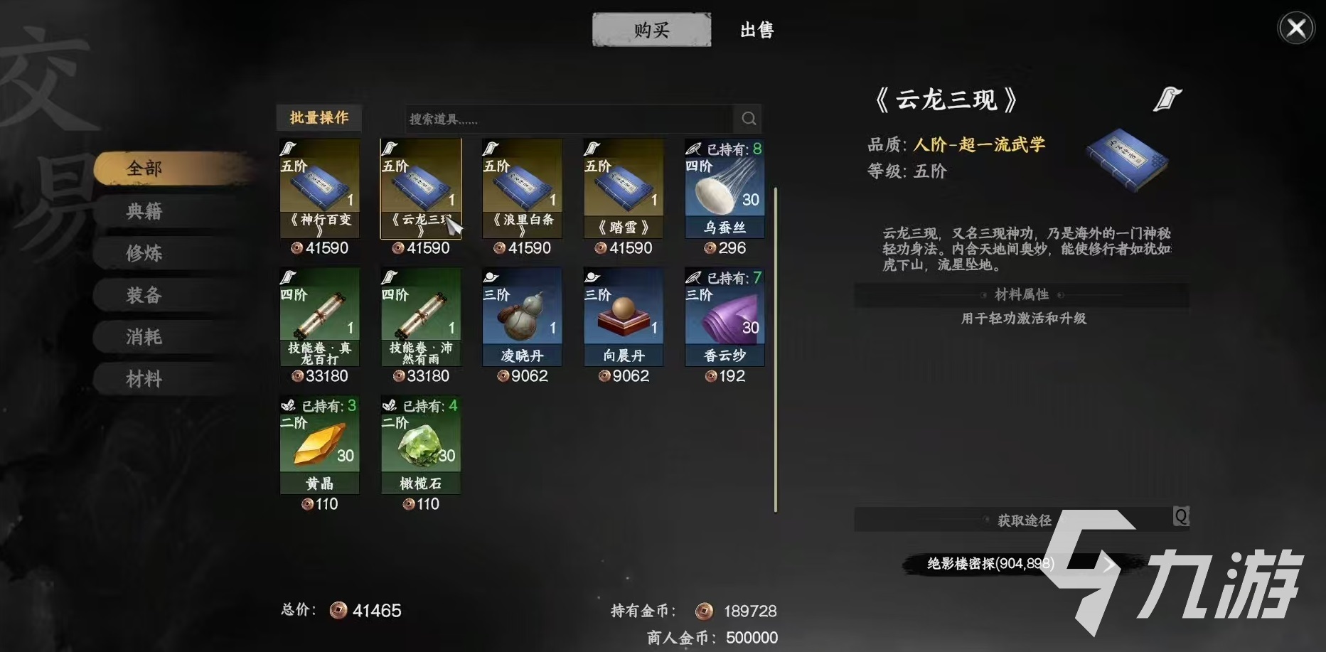 要想在下一站江湖2中获得轻功,主要通过购买和完成任务获取这两种方式。先来看一下最简单的购买,在地图中找到枰栌904、899处,在这里可以发现一个绝影楼密探,和他对话之后可以购买到多个金色轻功。其中主要包括神行百变、云龙三现、浪里白条和踏雪,这都是轻功中非常出色的功法,建议大家在集齐资源之后全部兑换拿下。虽然购买很方便,但是必须将剧情推进到之后才可以购买,所以还需要其他方式补充。