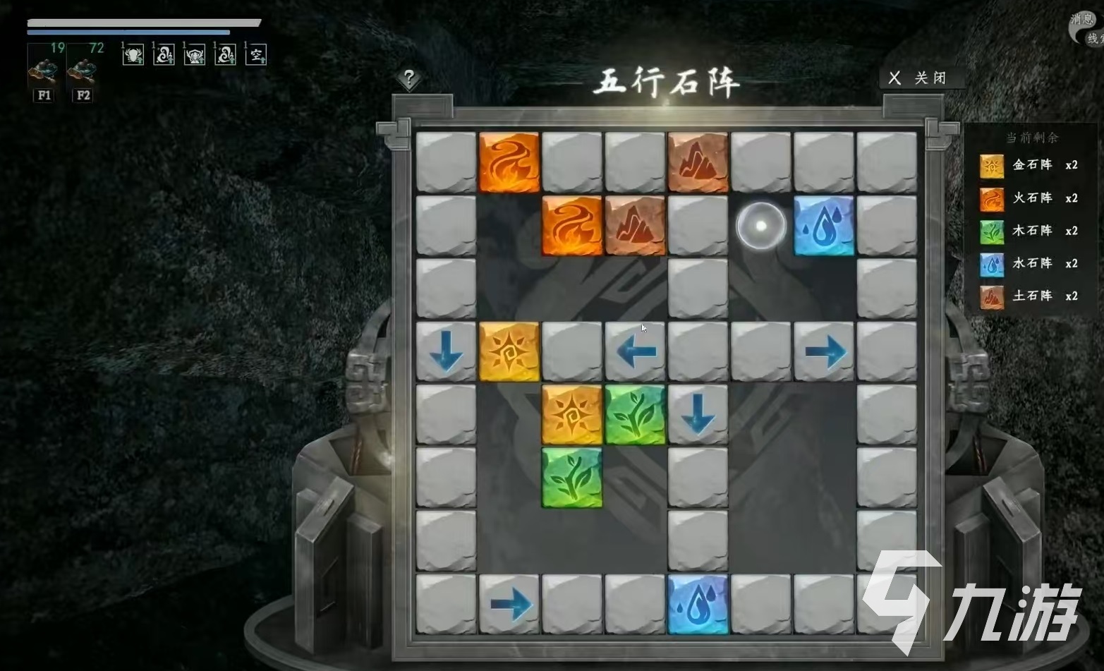 玩家可以利用方向键将光标移动到箭头石块上,并使该行或该列的石块,朝指定方向移动,移动相同颜色的石块,让相同颜色的石块相邻排列,就可以触发消除机制,将所有的石块都消除后就可以完成解密打开地宫的路口。也可以按照金木水火土的五行顺序来点击,也可以顺利解开。而且每一次出发的阵型都是不一样的,可以多次触发,尽量找到一个相对简单的再进行尝试。完成之后就可以进入到地宫的主体部分,整体采用的是主通道加分支密室的结构组成,在主通道两侧,分布着很多隐蔽的岔路,以及可以进行交互的物体。