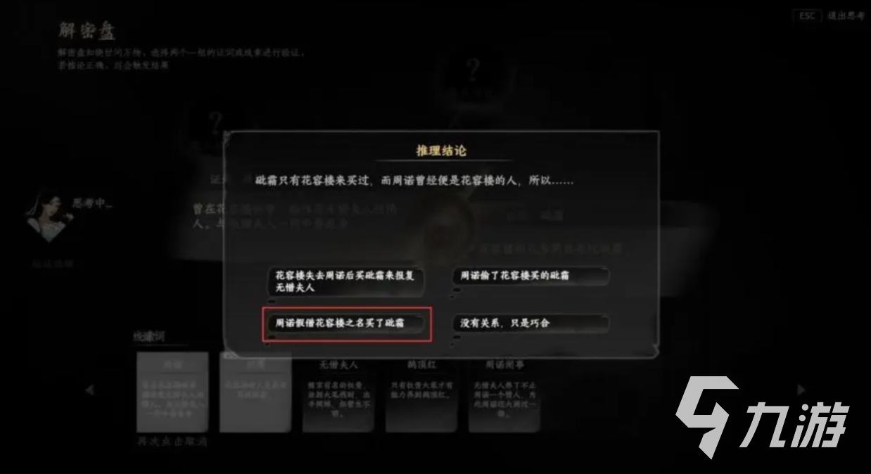 再来到福兴镖局附近和药铺掌柜对话拿到线索二,开始推理选项下图中第一个结论,然后三四组合选择最后一个结论,最后继续推理选择上面第二个即可完成,完成解谜后我们会自动拿到信鸽,跟着信鸽上的地址去找相饮川对话就能获取丹药。