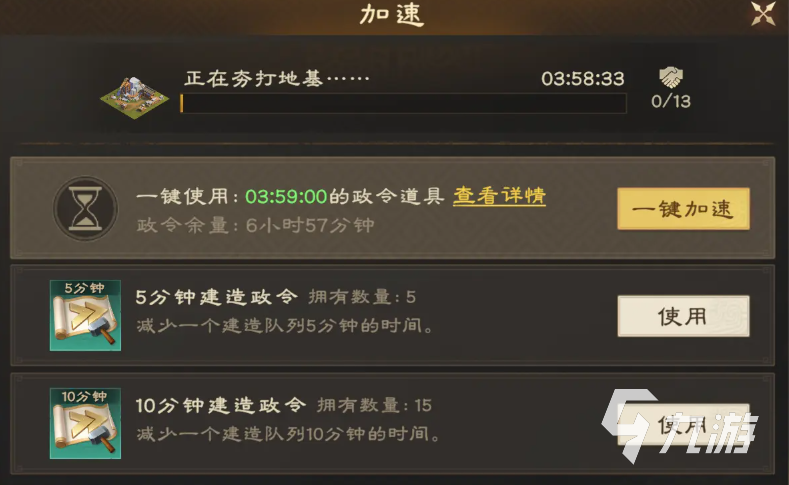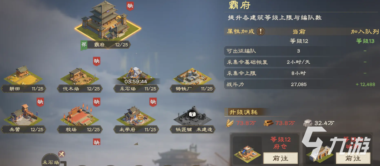 建筑升级应以主线章节为准,每个建筑升级都可能有前置条件,例如升级霸府至12级,需要府仓和城防等级达到相应要求。建筑升级消耗资源和时间,但初期活动通常提供大量加速道具,可在开荒前三天充分利用,加快进度。除了加速道具,任务和活动也会提供丰富资源,用于建筑升级和扩张。与此同时,战力提升同样离不开城建支撑。校场直接影响部队容量,是提高队伍战力的关键,太学府则负责科技研究,解锁二级兵、三级兵乃至更高级别的兵种,这些都会显著提升战斗力。资源获取方面,耕田、伐木场、采石场和铸币厂四大基础资源建筑是主要来源,跟随主线逐步提升等级即可。同时,通过采集令可提升采集速度,初期尤其注意石矿资源的补充,根据缺口合理分配。