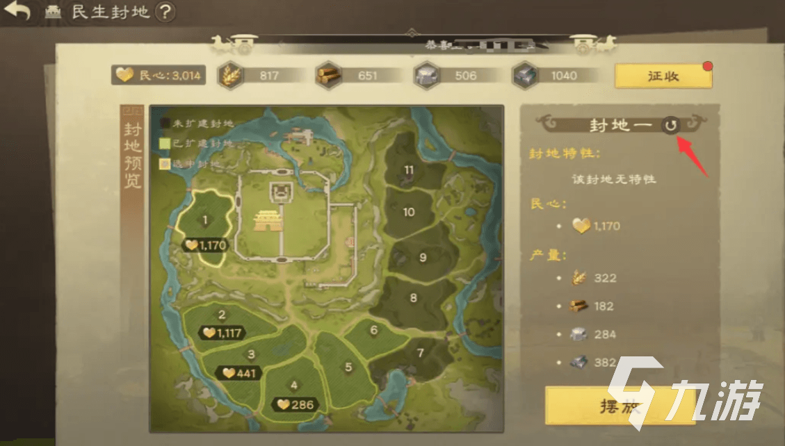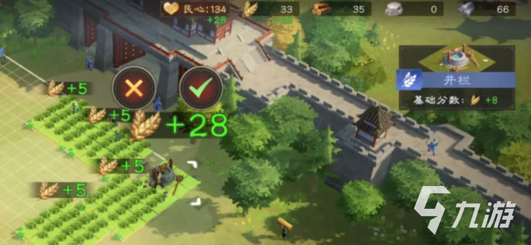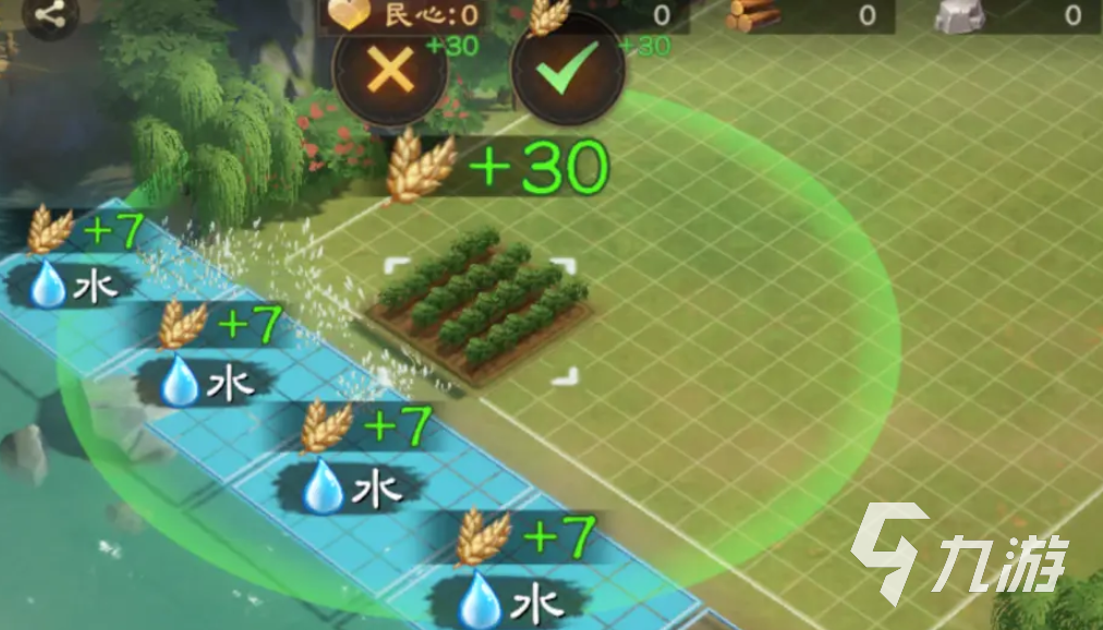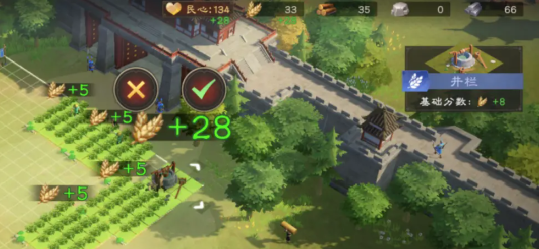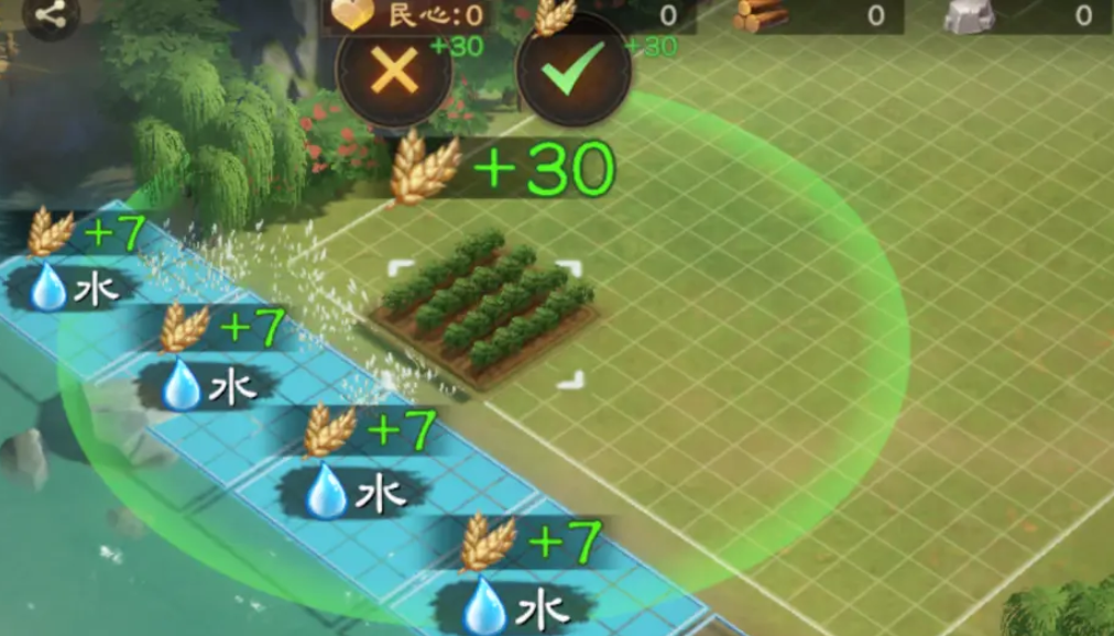 比方说像是田庄、伐木场等资源类建筑,就需要摆放在自然资源的旁边,如下图所示,一块田庄覆盖了更多的水,就能获得更多的分数,同理摆放伐木场的时候,如果能覆盖更多的树,也能获得更多的分数,最后大家在扩建多个封地后,如果需要将原本上面的建筑给全部拆除重放,可以使用封底重置功能,这样效率将会更快。