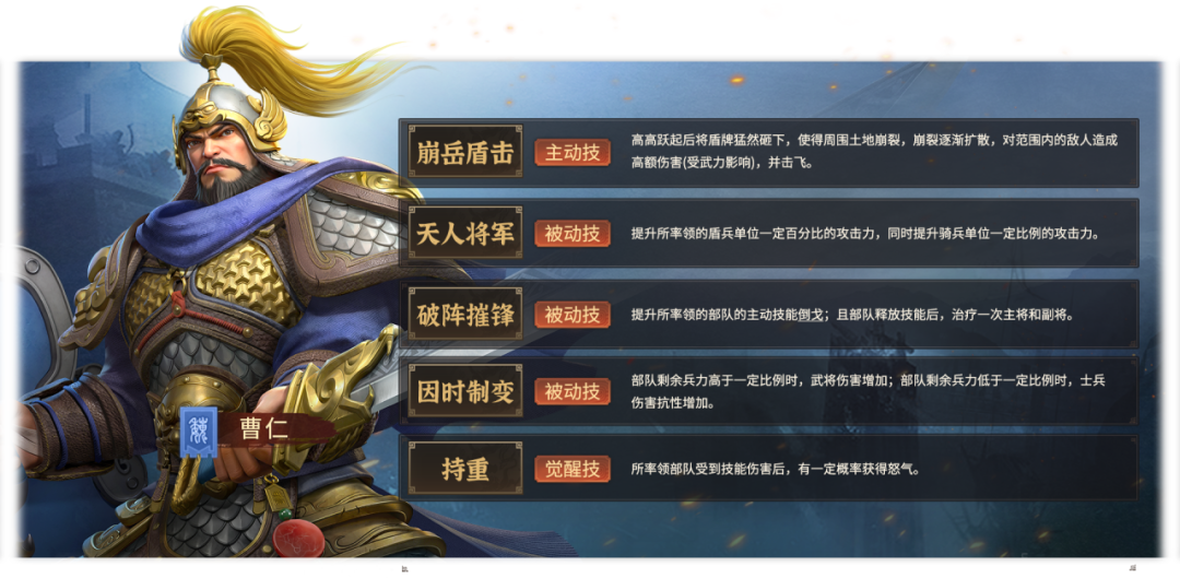 与曹仁的性格一脉相承,他的技能名也兼备了稳重与锐利。