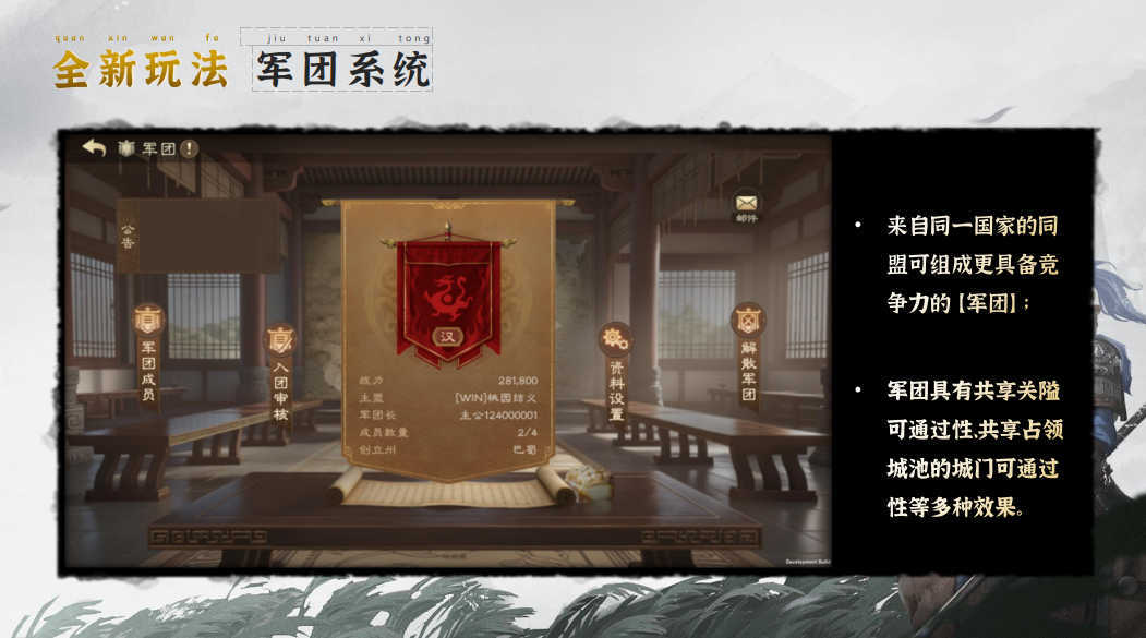 同国同盟可组建军团,共享关隘通行、城池增益等权限,而同国不同军团仍可互攻,为外交博弈留足空间。
