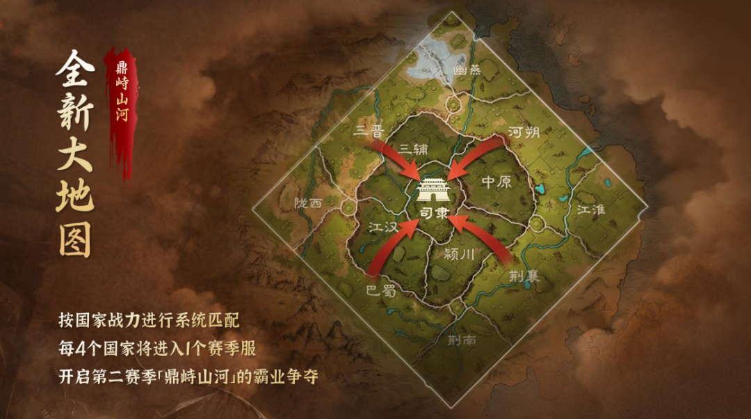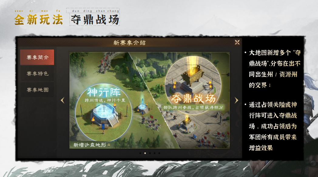 大地图新增了多个“夺鼎战场”,分布于各州交界,需通过关隘或神行阵进入,以军团为单位限时争夺,积分榜首军团可获全成员属性增益,荣耀与实力并存。