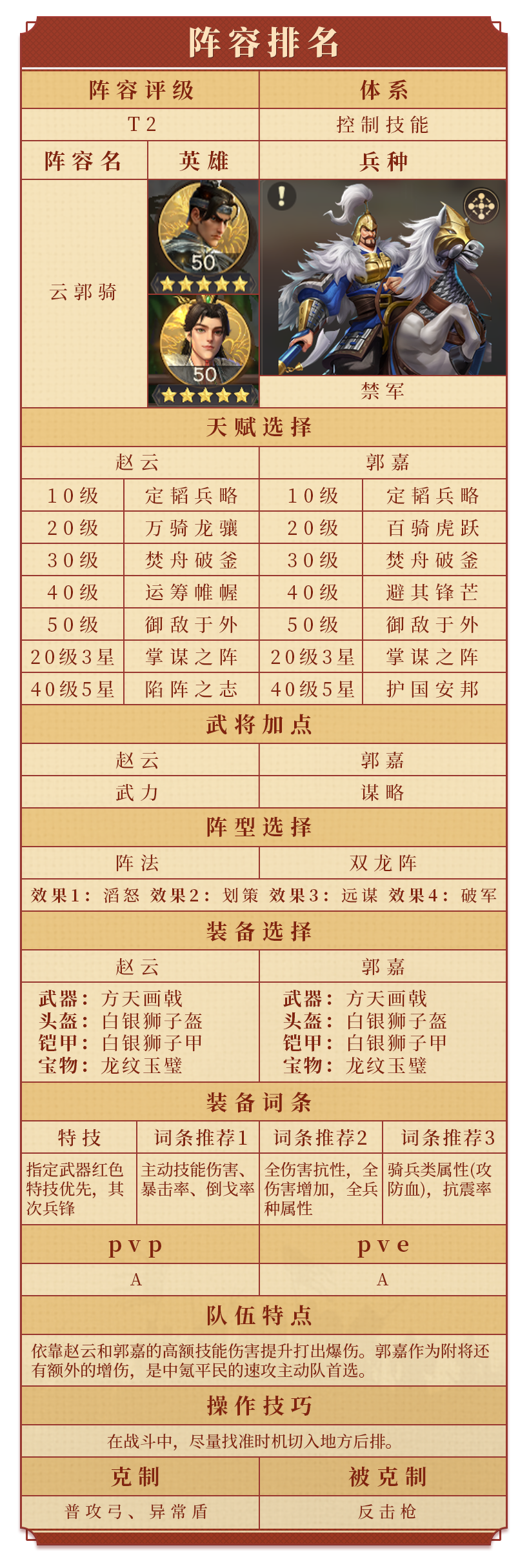 一些个人心得(小氪金):①全力发展主城堡等级,22级就可以开四级兵和五个队列,队伍先整一个主队其他都是辅助,全力挖矿,尽量把采集令获取时间最大化(军介) ②大卡包排在前四个初始战力是9600是核心卡,不过诸葛亮目前几乎没人用抽限定卡包400抽可以额外领取两个限定将,本人430抽左右出了5个限定将,换算金珠大概是3万5千左右,合起来就是7个限定将,觉醒需要16个,不是太急或者大氪金可以分俩次活动比较好一些,每次限定可以一个十连,抽取后可以领取,相当于白送,这个抽取不是很固定,一次活动觉醒的话,金珠消耗在6--10万,甘宁太史慈组合在一个卡包里,但是个人感觉,小卡包抽取概率还是有锁卡的现象,有一种小保底,大保底的感觉。 ③一赛季大氪金或者喜欢玩爆发的可以整吕布+张辽,不过要求红度必须高,毕竟是技能爆发,红度太低没什么用。打群架刘备+张飞,扎在人堆里利用回血加反伤效果很好,目前版本拼的是回复。甘宁+太史慈强度也很高属于普攻队伍,目前没有出来,不过感觉这个队伍开荒应该很厉害,当然同样需要高的红度,回复量也是很高的。目前版本几乎没有人玩异常队伍或者控制队伍,无论是打架还是打副本效果都不是很好,不过张角出来或许会有人玩。
