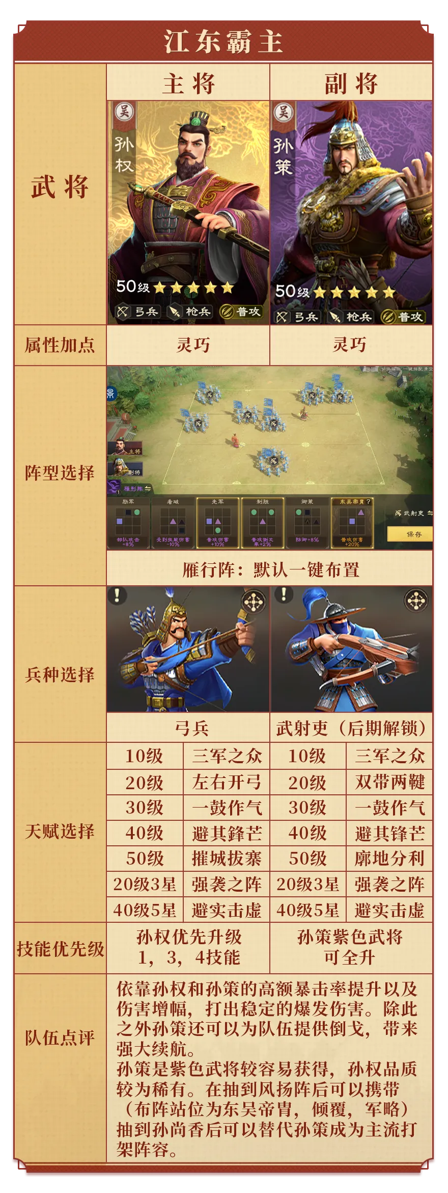 此队可直接作为开荒队使用,可作为克制反击队使用的队伍,且自身弓兵枪兵双切的特性能适合各种克制环境,且前期就可用。