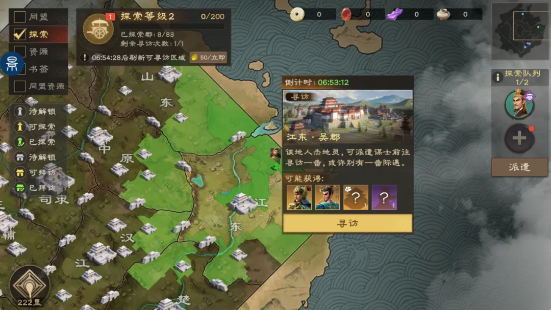 打开大地图寻访开关,每天在一些已探索的郡会变成可寻访,主公可以对指定位置派遣谋士进行寻访,寻访与探索类似,同样需要时间;