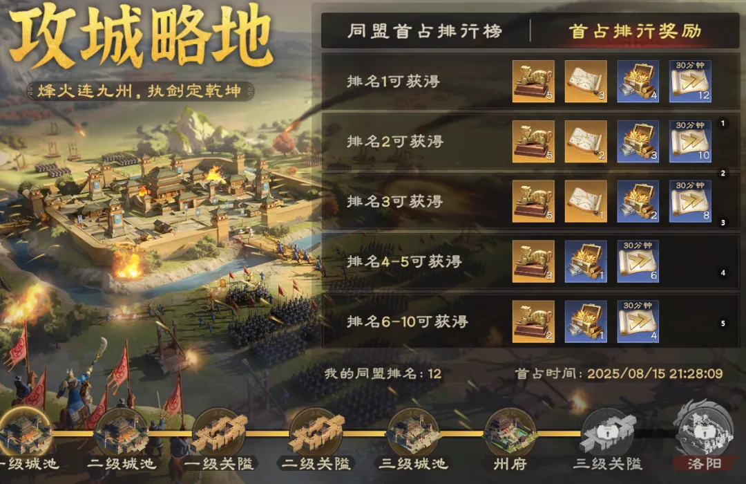 除此之外,同盟攻城在全服会进行排名,首占速度越快同盟奖励越丰厚。
