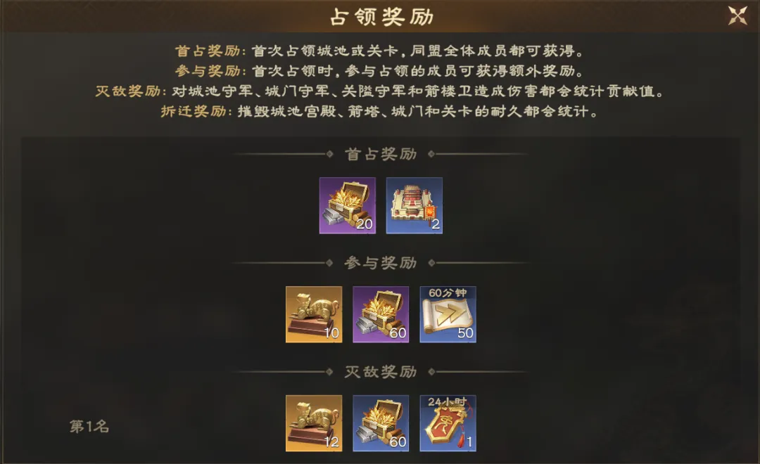 参与同盟玩法尤为重要,上述已经讲过PVP和PVE中的定位,最终在整个同盟系统中也可以获得诸多各类奖励。如攻城首占获取奖励。