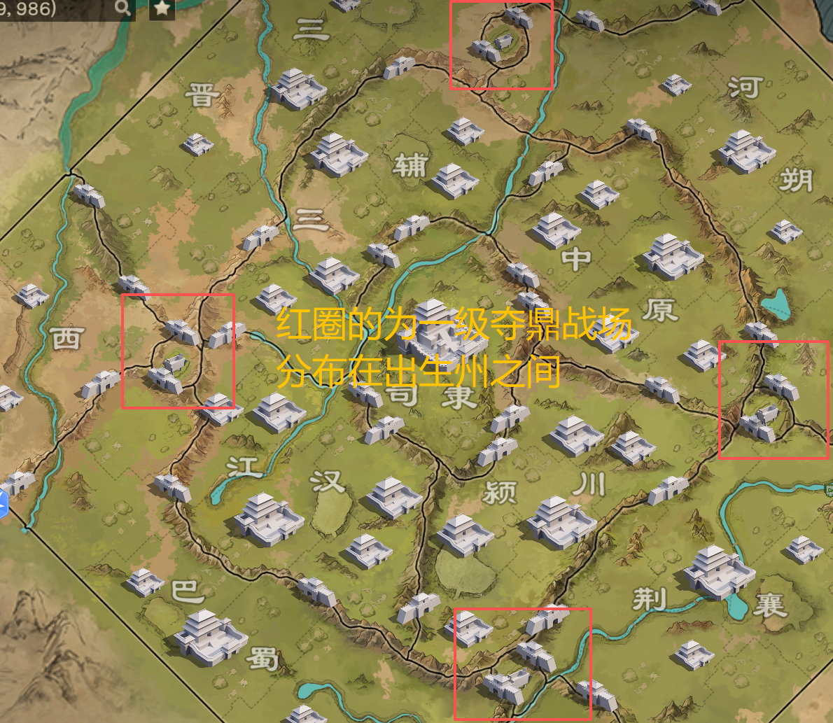 ●一级夺鼎战场:一共4个,分布在出生州之间两两相连,可通过链接的关隘进入;