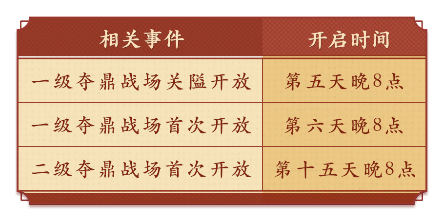 夺鼎战场开放时间如下,其循环周期则为每六天一次: