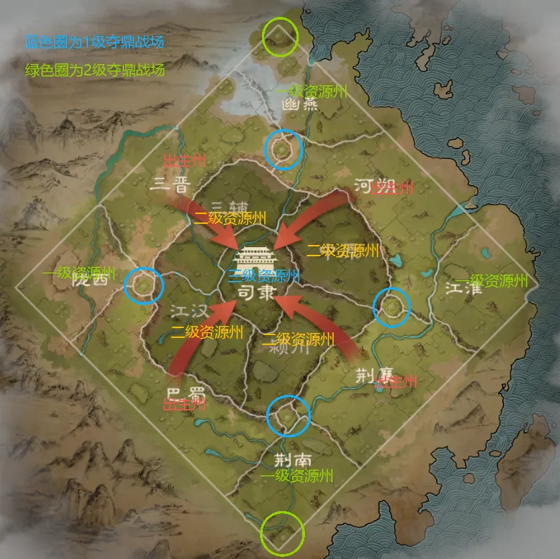 ● 一级资源州:最先开放的争夺点,为江淮、陇西、幽燕、荆南;