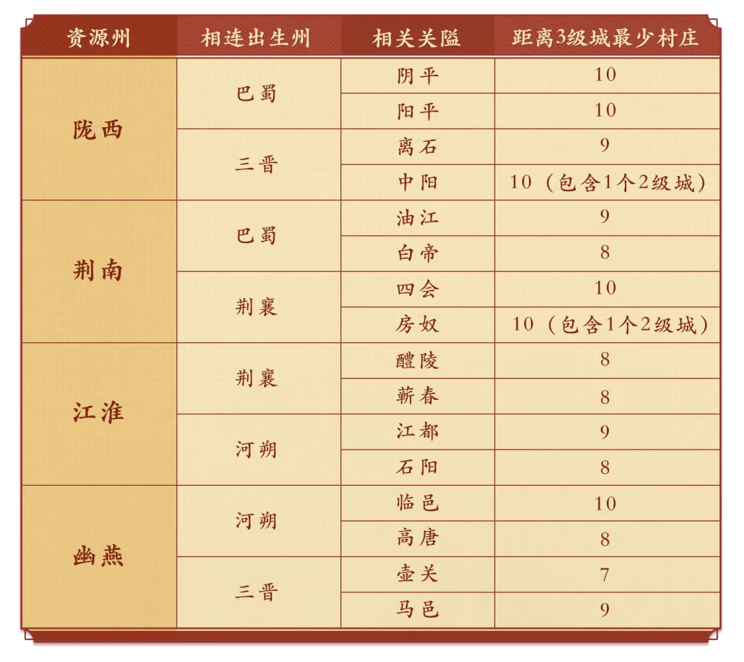 同时,由于每个出生州各个关隘到3级城的村庄路径完全不同,而提前接近3级城甚至围住3级城优势极大,此处阿武给出一张手动统计的表格供各位主公参考: